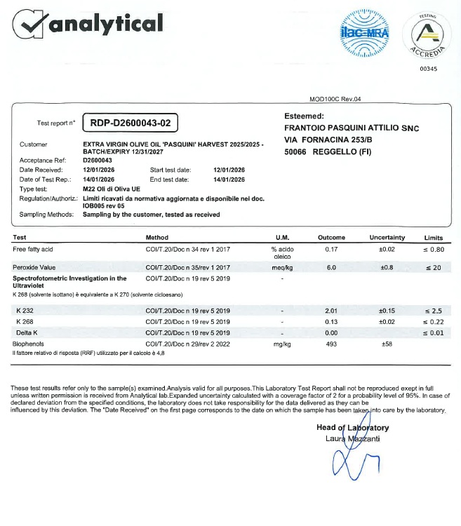 Oliwa z oliwek otrzymywana w olejarni Pasquini ma charakterystyczny, intensywny aromat, bardzo wyrazisty, przyjemnie otulający smak,